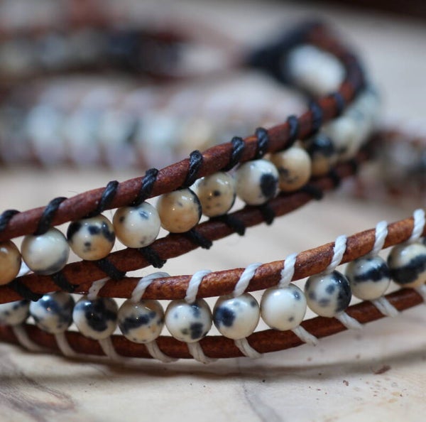 Dit enkelbandje is gemaakt met natuursteen kralen en echt leer. Het bandje is in maat verstelbaar door zelf de knoop strakker of losser te maken.